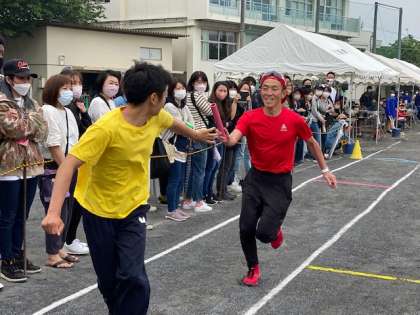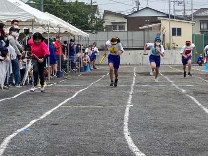 2学年女子学級対抗リレーに教員チームがサプライズで参加しました。スタートから大盛りあがりです。