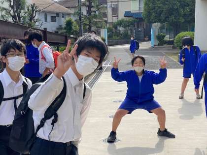 「さようなら!3中Todayいつも楽しみにしています。」「ありがとう。明日も元気に登校してね!」 陽気なあいさつを交わします。
