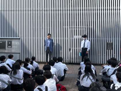 写真は、新横浜駅南口広場の出発式の様子です。添乗員さん、看護師さん、写真やさんの紹介がありました。