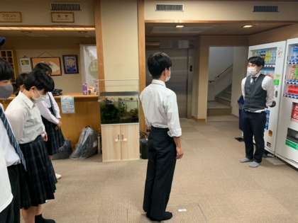 「修学旅行28」 公開日 2022/06/06 更新日 2022/06/06 お知らせ 「おはようございます」朝食を済ませ、宿の方に実行委員が代表してあいさつします。「お世話になりました」 朝の時点では、全員元気です。