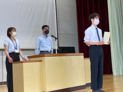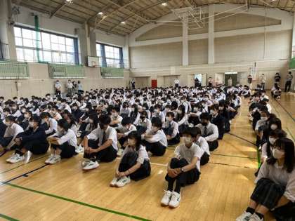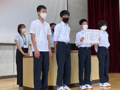 月曜日の朝、8時25分のチャイムと同時に全校朝礼が始まりました。特に、3年生の整列状況が素晴らしいです!! 最後には、卓球部とバドミントン部の表彰がありました。