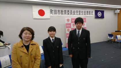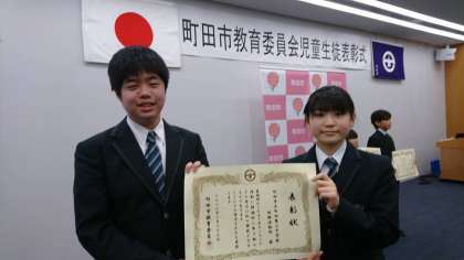 本日、町田市教育委員会児童生徒表彰式が庁舎で行われました。本校からは、水泳と体験活動部が受賞しました。