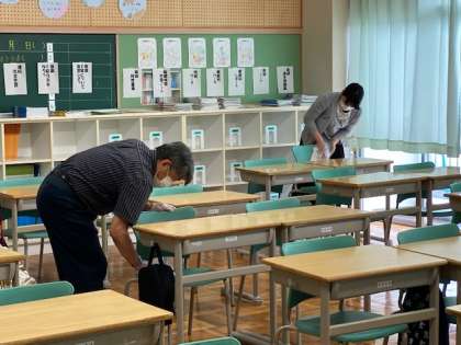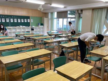 特に、多くの生徒が手を触れる箇所(ドアノブ、手すり、スイッチなど)は、念入りに消毒を行います。