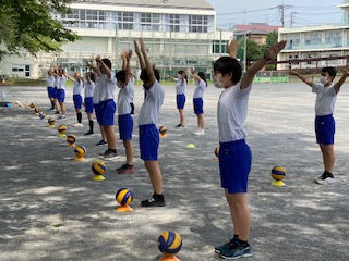 6月9日(火)「授業観察」 公開日 2020/06/09 更新日 2020/06/13 お知らせ ソーシャルディスタンスを保ちながら、体育(バレーボール)の授業に取り組みます。一人一つずつボールを持ちオーバーパス・アンダーパスの個人技能の習得に励みます。