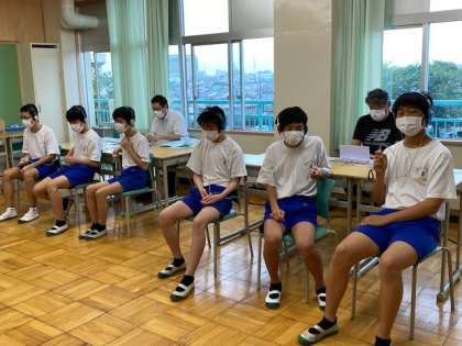 写真は、3年生の身体計測の様子です。ソーシャルディスタンスを保ちながら、聴覚検査と身長を測ります。