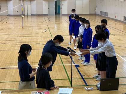 6月22日「生徒会朝礼1」 公開日 2020/06/22 更新日 2020/06/22 お知らせ 「Meet機能」による生徒会朝礼を実施しました。体育館では、前期常任委員長へ校長先生から「認証書」の授与と、生徒会長及び各委員長のあいさつがありました。