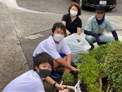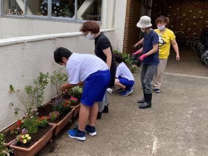 「地域協働活動2」 公開日 2020/07/07 更新日 2020/07/07 お知らせ 写真は、職員玄関前のプランターに苗を植える様子です。用務主事さんと保護者の方の支援のもと、体験活動部を中心に取り組みます。