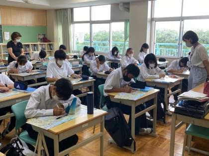 9月2日(水)「横浜校外学習」 公開日 2020/09/03 更新日 2020/09/03 お知らせ 写真は、1年生の横浜校外学習事前指導の様子です。各クラスの班長が集まり、コースを決める上での注意事項やチェックポイントを確認します。