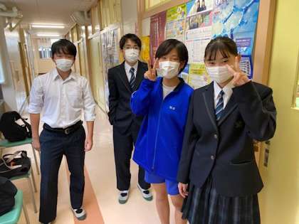 写真は、高校入試の面接練習後、緊張から開放されホッと一息!をつく様子です。