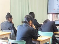 1年生英語は、一人一人がALTと英会話をしています。また、後半の写真は社会の授業...