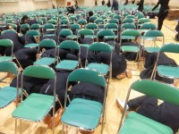 3月13日(金)、体育館で卒業式の予行練習、表彰が終わった後、地震を想定した避難...