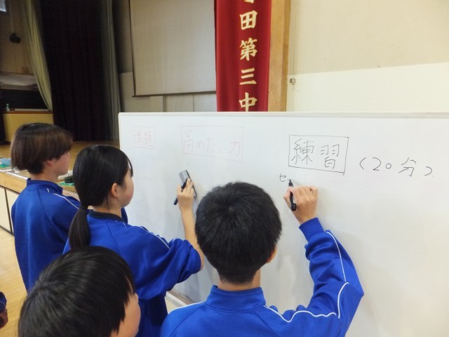 練習が終わり、本日の授業は終了しました。授業後、きょうの授業について、協議会と講師の先生からご助言をいただきました。さらに三中生全ての生徒が、自分らしく成長を感じるような授業を目指します。これからも、...