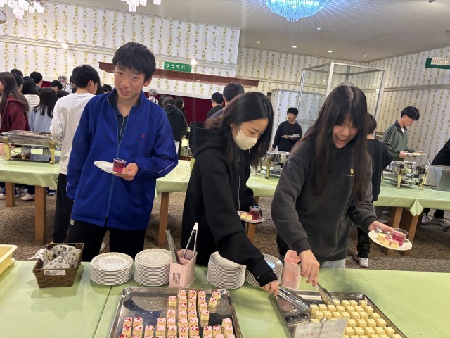 スキー教室2日目 終了夕食は昨日に引き続きバイキング形式。「昨日と同じメニューかな?」と少し気にしていた人がいましたが、食堂に入るとラインナップが一新。あちこちで「やったー!」とテンションの上がる声が...
