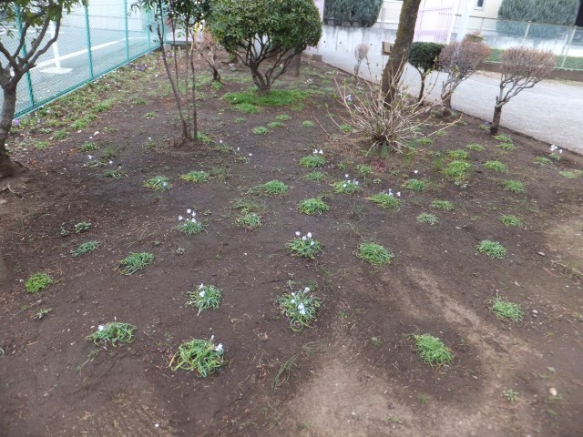 3月13日(金)正面玄関前、しだれ梅の根本付近の花です。用務主事さんが、校地の他の場所で種がこぼれ発芽したものをこの場所に移植し、ついに花がたくさん咲き始めました。