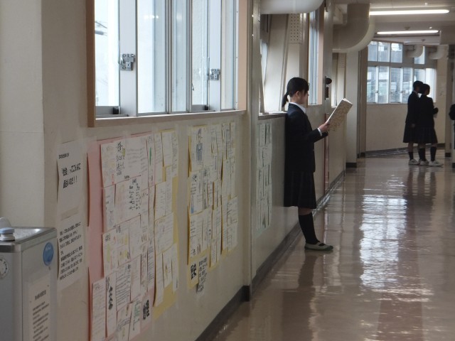3月19日(木)、本校第58回卒業式です。写真は、登校後の在校生の様子です。在校生代表の言葉を話す生徒は、一人廊下で練習をしていました。緊張するはずです。この後ほどなく、卒業生が登校してきます。