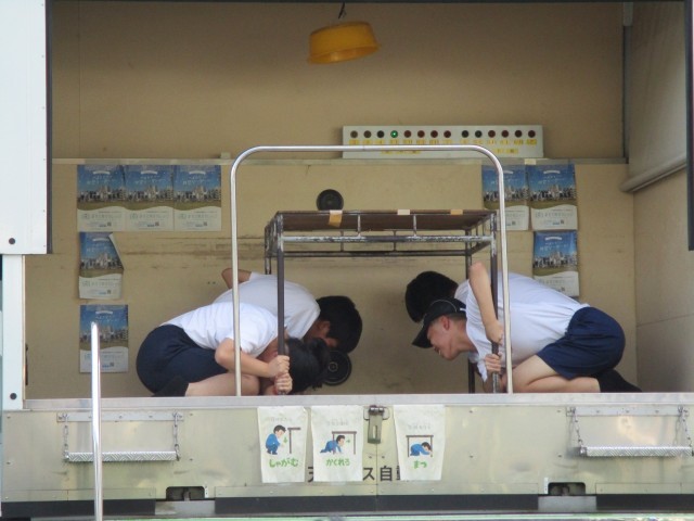 生徒たちは、起震車に乗り実際の地震の揺れがどの程度のものかを体感し、
