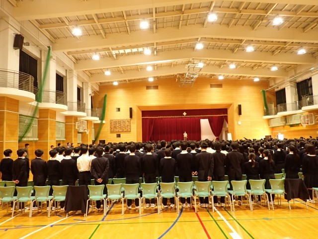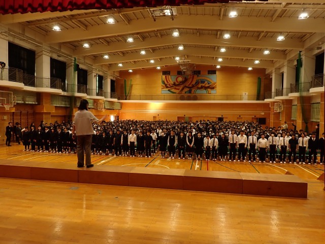 全校生徒で校歌を歌っているところです。この声、聞こえますか?700名以上の歌声は圧巻です。皆さん、ぜひ明日聞きに来てくださいね。