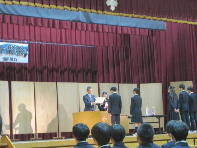 先日、10月24日(金)は音楽祭が開かれました。午前中は1年生合唱、8組のハンドベルと合唱、2年生の合唱が披露され、午後は圧巻の3年生の合唱、そして、合唱部や吹奏楽部の各演奏に続いてのコラボ演奏と、会場は大盛り上がりでした。どの学年どのクラスも練習の成果を発揮した力強さを感じる歌声を披露してくれました。