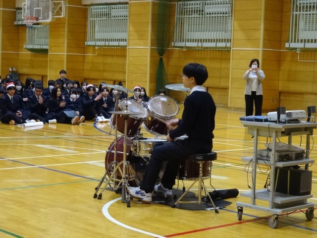 本日、今年最後の学年集会が行われました。英語が堪能な生徒のアナウンスから始まり、ドラムをやっている2人の生徒がオープニングを飾ってくれました。普段の学校生活ではなかなか見られない姿が見られて、生徒たちは大いに盛り上がっていました。その後は学級代表委員によるクイズ大会でした。1年から3年生までの学校生活やクリスマスにちなんだ出題があり、正解についてああでもないこうでもないと和気あいあいと楽しんでいました。生徒主体の学年集会をスムーズに運営できる青学年。今年最後に大きな成長を見せてくれて、ありがとうございました。