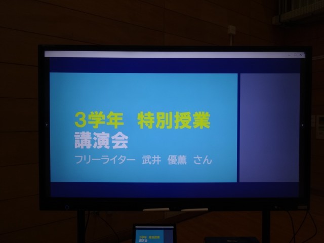 2月6日(金)5・6時間目に3学年で特別授業を行いました。武井優薫様に来ていただき、講演していただきました。講演テーマは『ジャングルと島』。武井様は青年海外協力隊としてパナマに、その後は地域おこし協力隊として岡山県の真鍋島にて活動されました。パナマはジャングル、真鍋島は文字通り島と私たち中学生には未知の体験をお話ししていただきました。その中で『当たり前』のお話がありました。今の皆さんの当たり前は世界の当たり前ではないかもしれない。その国、その土地、そのコミュニティごとに当たり前があること。自分の世界だけではなく、いろいろな世界の当たり前に目を向けること。そうすれば様々な考えに出会い、たくさんの経験ができること。最後に南中の3年生に『いろいろな〇〇』をたくさん経験してくださいとメッセージをいただきました。今回の講演を参考に3年生たちは卒業までにどう過ごすのか、4月から新しい世界への準備を進めて参ります。この度はお忙しい中、貴重な機会お話を聞かせていただき誠にありがとうございます。