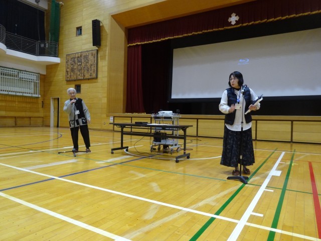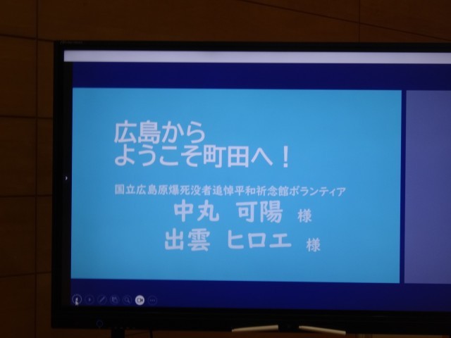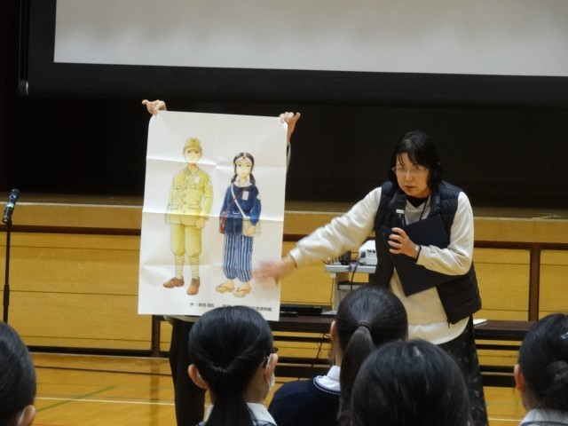 2月13日(金)総合の時間に国立広島原爆死没者追悼平和祈念館ボランティアの中丸可陽様と出雲ヒロエ様に来ていただき、平和講演をしていただきました。はじめに原子爆弾の恐ろしさを伝えるための映像を視聴しました。1年生より平和学習を続けてきたので、目をそらさずに真剣に見ていました。当時の惨劇をしっかりと受け止められる姿に3年間の成長を感じます。