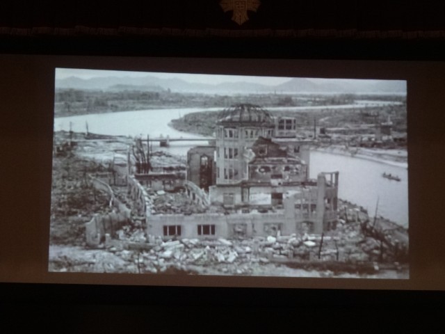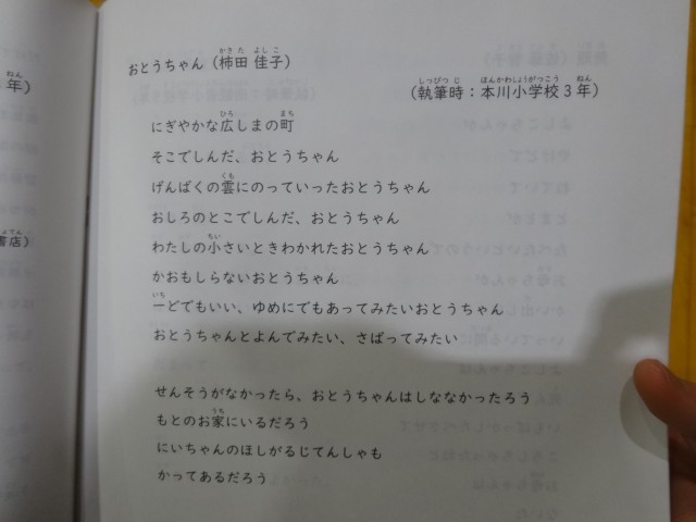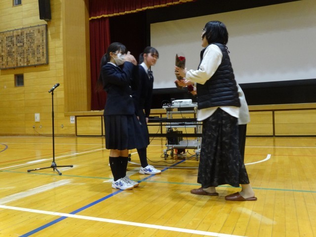 そのあとは、詩の朗読会へうつりました。生き残った方々の悲痛な思いのこもった詩を朗読していただき、創造力を働かせて聞く姿勢はさすが3年生でした。4人の生徒もボランティアで詩を朗読しました。それぞれの生徒がそれぞれの思いを込めて朗読しました。選んだ理由もはっきりと伝えることができていました。