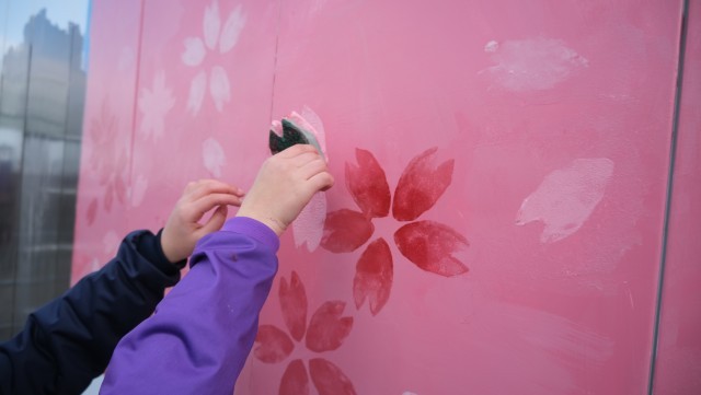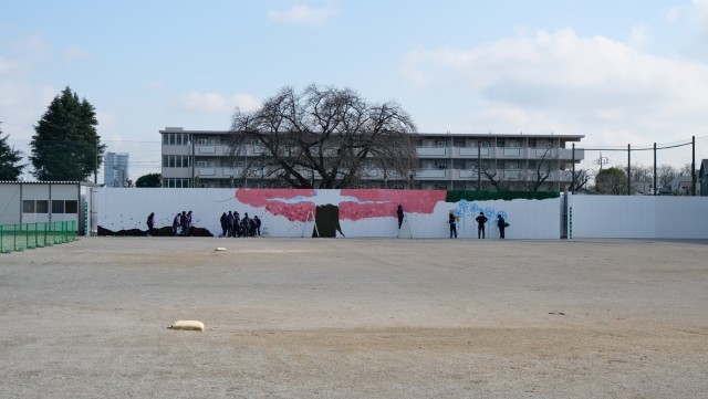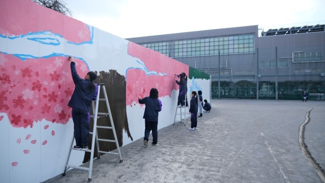現在、美術部が卒業式と入学式に向けて、校庭の壁に桜の木の壁画制作に取り組んでいます。工事のため、本物の桜の木が見えなくなってしまったことから、その代わりとなるよう大きく広がる枝を描き、スポンジを使用して桜の花びらを表現しています。完成が楽しみですね。