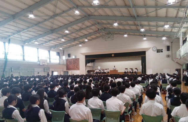 本日5校時、体育館にて、後期生徒会役員選挙のための立会演説会が実施されています。