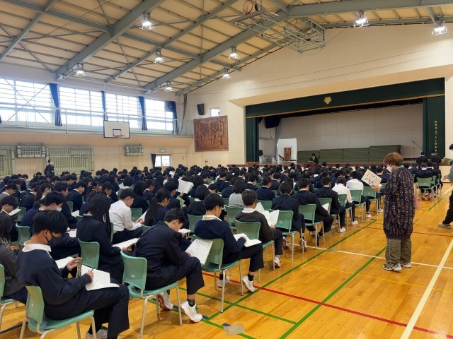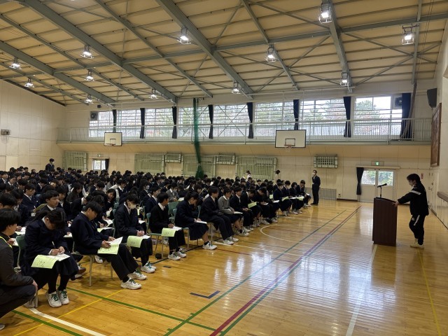 生徒主体で実行委員や各係からお話をしました。その後は教員から明日の整列の仕方や、諸注意について話しました。