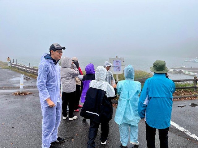 霧はなかなか晴れず、女神湖に到着しても湖面はおろか、ほとんど何も見えません。
