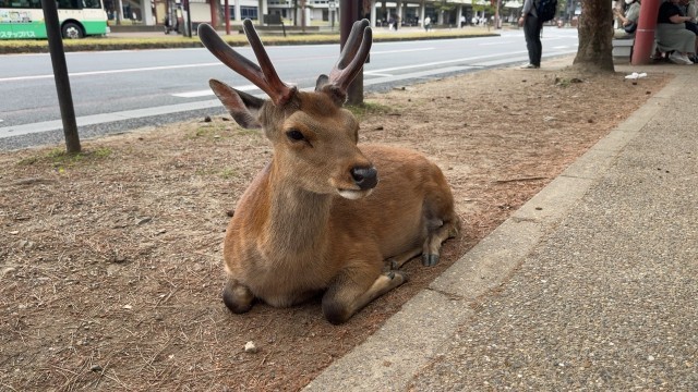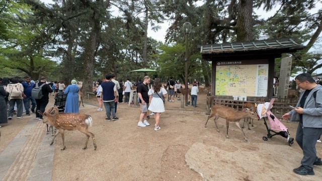 奈良へ到着しました。奈良公園にはたくさんの鹿がいます。外国人観光客もたくさんいます。東大寺で集合写真を撮ったらいよいよ班行動です。