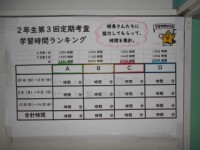写真は2年生のフロアの廊下に掲示してある表です。定期考査までの3週間で、各生徒がどのくらい学校外で勉強したのかを集計し、クラスごとにまとめた表となっています。家庭学習は時間をかければいいというものでは...