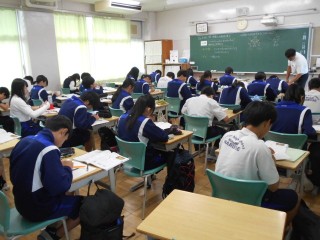3年生の理科の授業では、「斜面上の物体と重力」の単元を学習しています。この日は、1つの力を2つの力に分けた時の規則性を理解することを目標に授業が展開されました。授業の前半では、1つの力を2つに分ける力の分解の作図を定規などを使い一人一人が行いました。「分力」の角度が比較的大きくなると、作図が難しいと感じる生徒が多くいました。