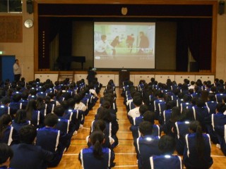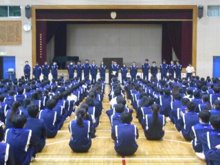 11月10日(月)、全校朝礼が行われました。校長講話では、友人同士でのトラブルの元となりやすいコミュニケーションの取り方が話題にあがりました。特にSNSではあいまいな文章を投稿することで誤解が生じやすいという具体例が示されました。その後、生活指導主任からは、10月の避難訓練で実施した、不審者侵入の際の対応についての確認をしました。避難訓練時には、生徒たちは教室でバリケードを作って静かに待機していたので、廊下での不審者の様子を見ることができませんでした。そこで朝礼では、不審者の動きを動画で確認し、改めて教室でバリケードを作って静かに気配を消す大切さを学びました。さらに10月に行われた町田市中学校連合体育大会で入賞した生徒たちの表彰も行われました。