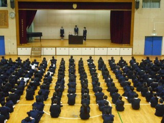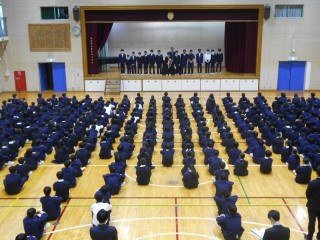 12月22日(月)生徒会朝礼が行われました。生徒会役員からはSNSの使用についての南成瀬中独自のルール(MSGs)についての説明がありました。また、12月26日(金)、27日(土)に行われるNANNARUフェスタについての話もありました。生活委員会からは週番チェックの方法変更についての話とスレスレ登校キャンペーンの予告がありました。保健委員会からは給食当番のマスク忘れが無いようにということと、給食準備が最近少し遅くなっているので注意しましょうという呼びかけがありました。図書委員会からは冬休み期間中に向けて本の貸し出し冊数を増やすこと、朝読書のルール変更、本のお楽しみ袋についての周知がありました。その後、AIの活⽤による英語教育強化事業の音読課題練習回数コンテストの入賞者と男子バレーボール部の都大会出場についての表彰がありました。