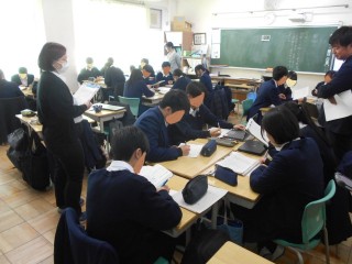 3年生の国語の授業では、古今和歌集を学習しています。和歌を学習し、歴史的仮名遣いや古文単語に触れながら古典の世界に触れて興味を持てるように授業が進められています。この日は、採用2年目の教員による研究授業が行われ、8名の教員が授業参観をしつつ公開授業が行われました。教科書に掲載されている和歌の中で、自分が印象に残った歌を取り上げ、その和歌を調べ読み取った内容をまとめ、現代的な視点で和歌を考えることが目的としてこの日の授業は展開されました。生徒たちは自分が気になり調べた和歌についての考察を班の中で発表し合いました。また、各班の中で発表が好評だった生徒1名が全体でも発表をしました。各生徒たちの歌に対する意見や感想を共有でき、また、平安時代に生きた人々の考え方が現代の考え方と共通している部分があるということを感じられる授業でした。