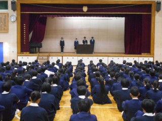 2月16日(月)、生徒会朝礼が行われました。生徒会役員からは2月末の定期考査に向けての話がありました。生活委員会からは「週番のルール」、「3月の卒業式練習時における1・2年生のネクタイをもってこようキャンペーン」についての告知がありました。保健委員会からは「健康増進キャンペーン」として給食時の昼の放送で健康クイズを実施し、昼休みに希望者を対象に視力検査を行うことが周知されました。図書委員会からは3月の本の最終返却日と電子書籍のパスワード管理についてのお知らせがありました。放送委員会からは昼の放送に流す音楽のリクエスト方法とラジオ放送へのお便り募集についての話がありました。