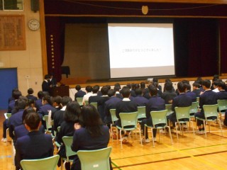 2月17日(火)の6校時に2年生は職場体験の事後学習として職場体験発表会を行いました。先週は職場体験を行った事業所ごとの全グループが各教室で発表を行いましたが、この日は、各教室で生徒による投票で選ばれた代表グループが体育館で発表を行いました。各教室で選出されたグループだけあって、どの班もわかりやすい発表でした。学年の教員・校長も発表を視聴し、「校長先生賞」などの賞が決まりました。2年生は様々な場面で発表をする機会が設けられているので、だいぶ発表に慣れてきました。聞いている生徒も集中していました。