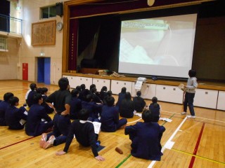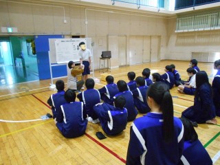 2年生の保健体育の授業では「傷害の防止」という単元を学習しています。この日は体育館で救命救急と応急手当についての学習を行いました。救命救急については、AED(自動体外式除細動器)の使用方法を動画を見ながら学びました。応急手当については、包帯法・三角巾の手技を身に付けることを学びました。代表生徒がモデルとなり、養護教諭による模範を見ながら理解を深めていきました。