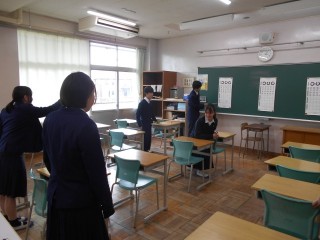 今週は保健委員会が健康増進キャンペーンを行っています。給食時の昼の放送での「健康クイズ」や昼休みの「視力検査」を実施しています。2月20日(金)は昼休みに3年生対象の視力検査を行いました。保健委員が中心となり、3年生の希望者に視力検査を行い視力を記録して渡しました。今年度の1学期に健康診断を行いましたが、病院に行った方がよいという結果が出た生徒へは、「結果のお知らせ」を配布し、病院等で治療などを行うよう伝えています。しかし、「病院へ行きました」、という返信のお便りの回収率は今年度低いのが現状です。今回の視力検査をきっかけに、「結果のお知らせ」を受け取った生徒は病院へ行き、検診で指摘された部分についてお医者さんに診てもらいましょう。