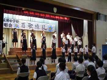 7月2日(土)に合唱会が行われました。この2週間、各クラスとも一生懸命、合唱練習に取り組んできました。合唱祭実行委員、パートリーダー、指揮者、伴奏者など、それぞれの役割をしっかり果たしながら、どのクラスも自分たちオリジナルの合唱を作り上げ、披露できました。感染症対策として、学年ごとの実施、課題曲を省き自由曲のみの合唱、マスク着用のままの歌唱、通常よりも間隔をあけた合唱隊形など、合唱をしにくい状況ではありましたが、生徒の皆さんの熱意で、素晴らしい合唱会となりました。