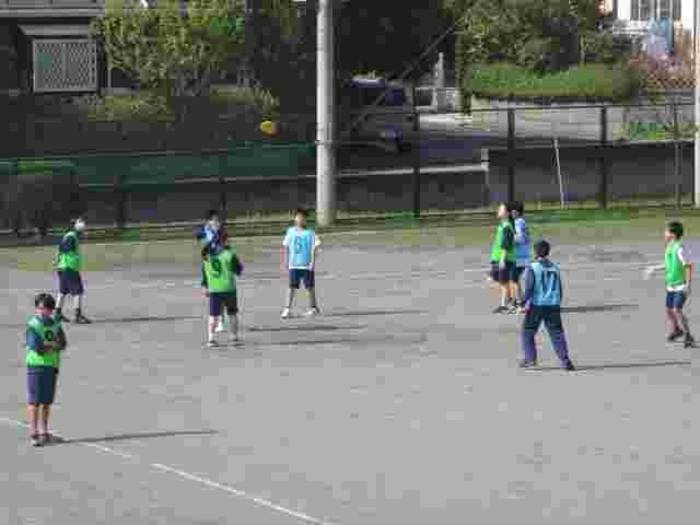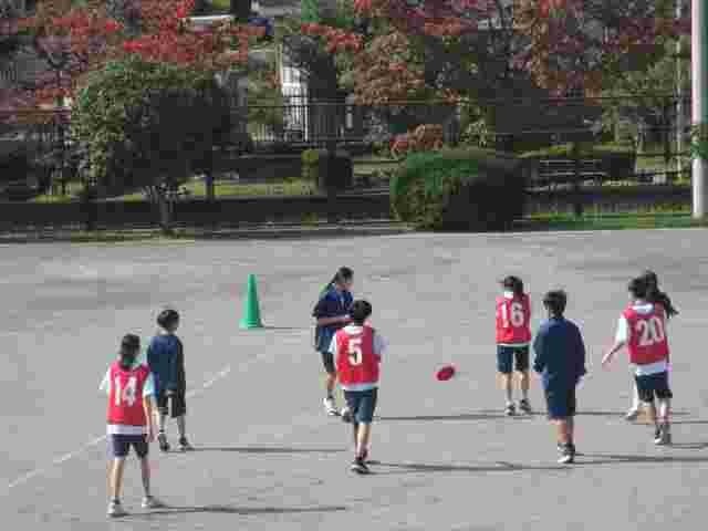 校庭で、アルティメットという競技のパスの練習を行っていました。