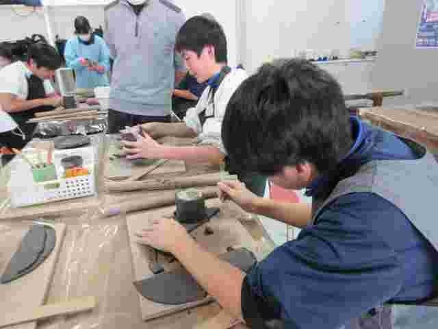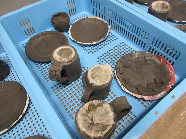 子どもたちは徒歩で子どもセンターつるっこへ向かい、施設の方の説明を受けながら、お皿とコップの制作に取り組みました。