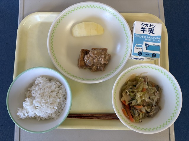 町田産キャベツと野菜の五目炒め、りんご、牛乳です。