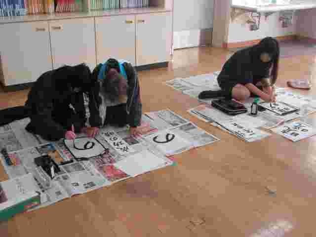 初めは縦や横の線、はらいなどを練習し、6時間かけて各学年の課題の文字を書きました。