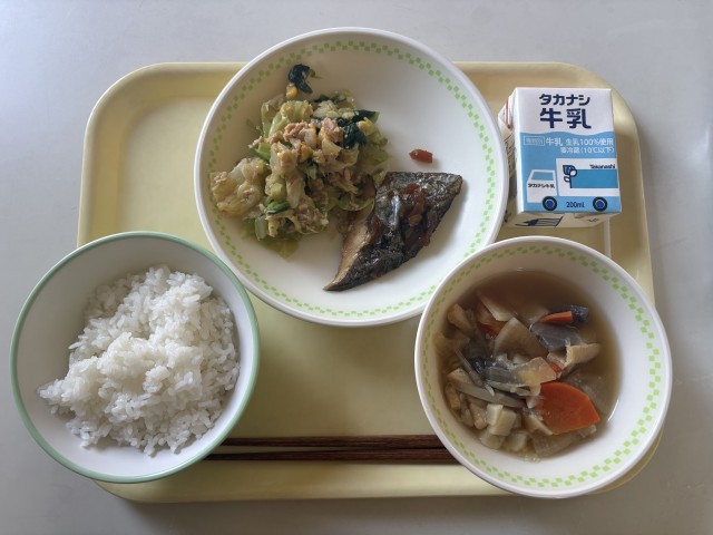 ごはん、かますの南蛮漬け、野菜のツナ和え、けんちん汁、牛乳です。