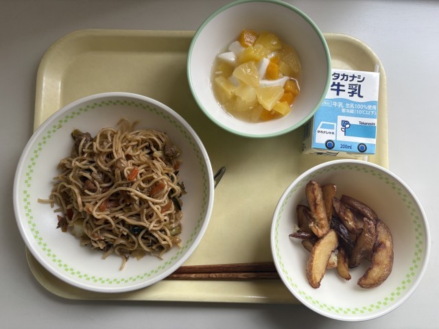 ソース焼きそば、ガーリックポテト、フルーツ杏仁豆腐、牛乳です。