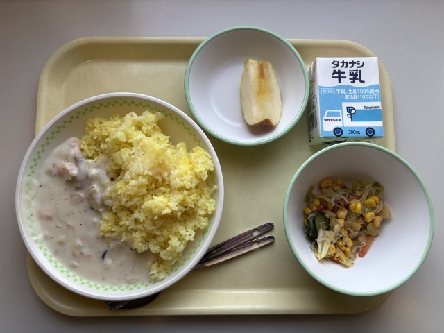 ターメリックライス、えびクリームソースかけ、町田産キャベツとじゃこのサラダ、りんご、牛乳です。