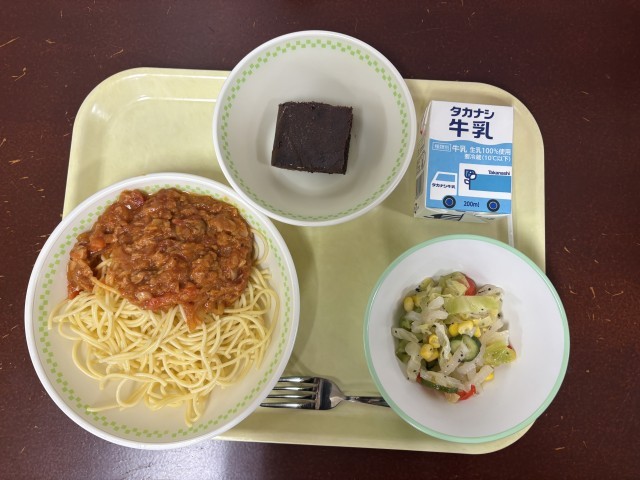 パスタ・コン・トンノ・エ・ポモドーロ(スパゲティツナトマトソース)、イタリアンサラダ、ドルチェ(チョコレートケーキ)、牛乳です。
