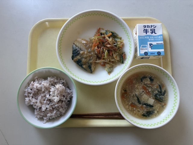 黒米入りごはん、さばのねぎみそがけ、もやしとキャベツのごま和え、むらくも汁、牛乳です。